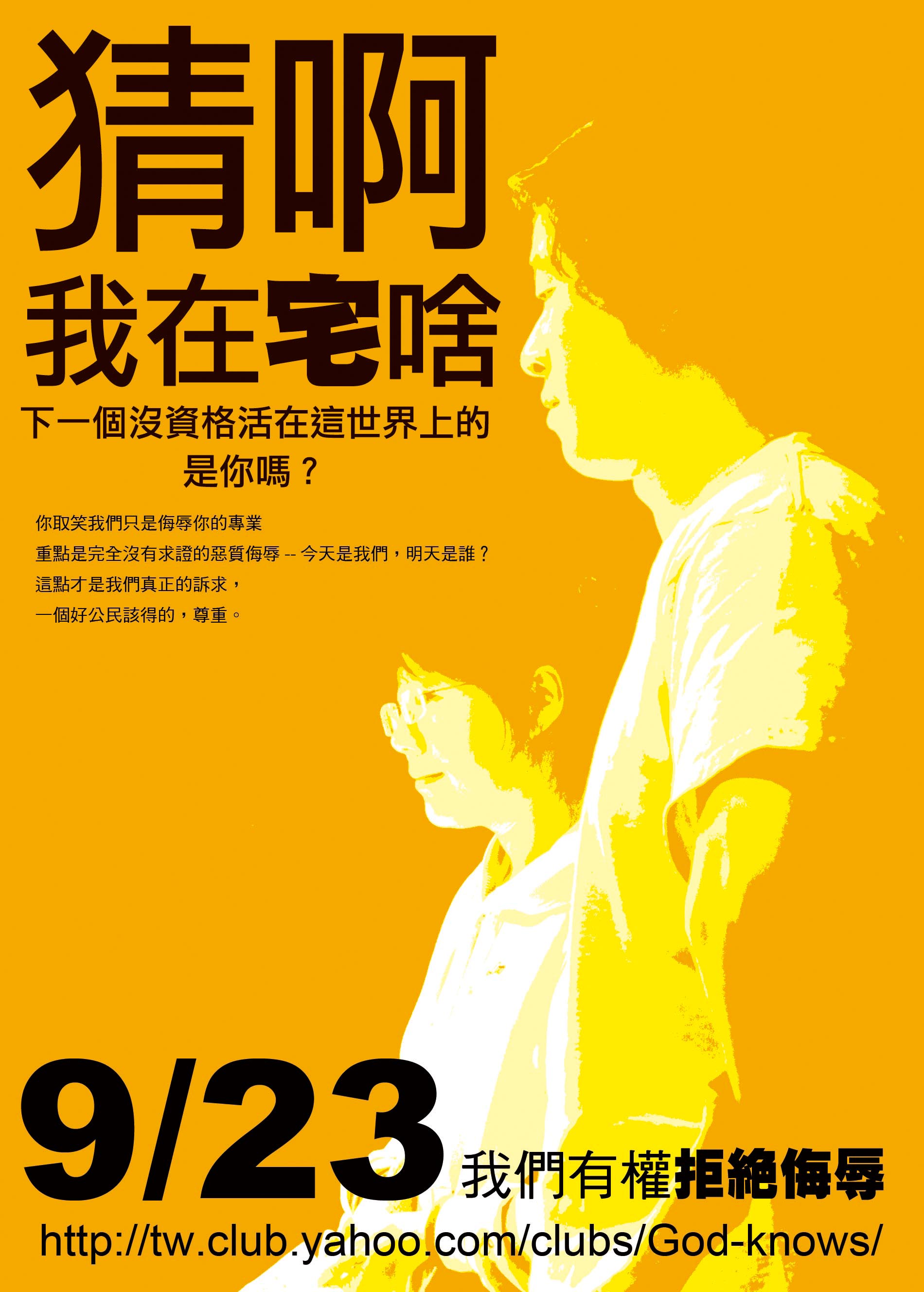 九月一日中視節目我猜我猜我猜猜猜中主持人擅自更改涼宮春日小說中內容 醜化其作品 造成觀眾誤解卻沒有當場合理解釋! 並以A書色情笑話來侮辱涼宮春日這本小說,中視為了節目效果,對御宅族在節目中做出譭謗,羞辱的行為, 雖然是為了節目效果,但也沒有在節目中打出標語,造成社會許多人士留下了非正面的觀念 來賓(大家都知道是誰)甚至口出例如[這種人不應該活在世界上][你們是心理變態]〔打扮很像電車上的變態〕 如此侮辱話語並以A書色情笑話來侮辱涼宮春日這本小說, 我猜該節目早已汙名重重,日前甚至公然指腐女為[骯髒][邋遢][醜陋]等使用多種不雅且不實的誹謗字眼 台灣霉體扭曲並汙名御宅及腐女以及COS一意已經行之有年,現在更直接到達對對方做出人身攻擊的地步, 廣大網友已經發起了到中視抗議運動 有人會說,一隻狗咬你你也要對牠咬回去嗎? 不少人便是抱這這種心態因此才助長了錯誤知識的蔓延 一隻狗咬你你便要對牠教導,讓牠瞭解咬人是不對的 請問我們動漫迷犯了罪麼? 請問我們看動漫有妨礙他人麼? 請問我們對自己喜愛的事物投以熱誠有錯麼? 請問我們該這樣默認接受他人侮辱麼? 請問我們該這樣承受外界的不實指控及抹黑麼? http://www.miumu.com/phpbb/viewtopic.php?t=3&mforum=acgclubs ================================================================== 轉於萌研...正文不知